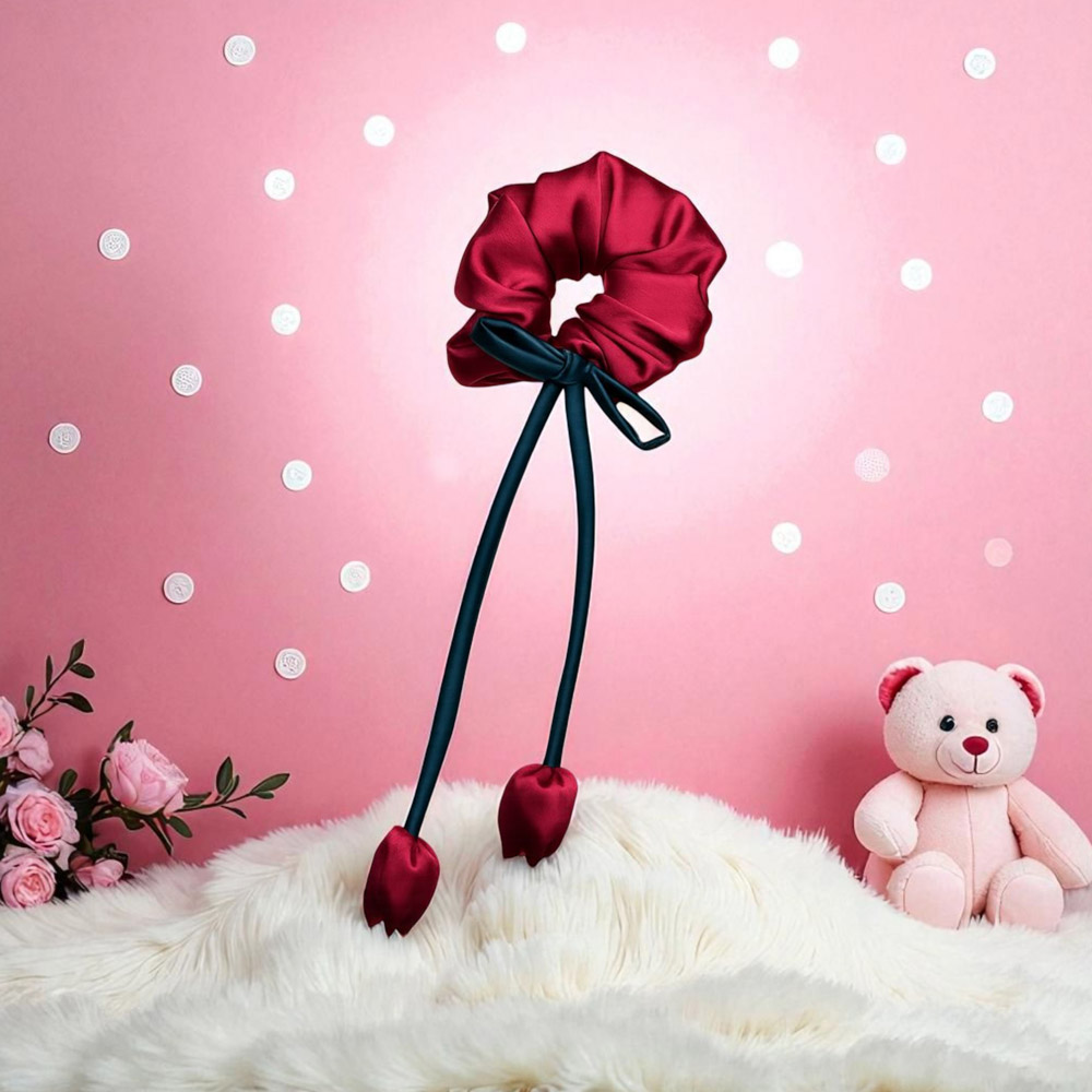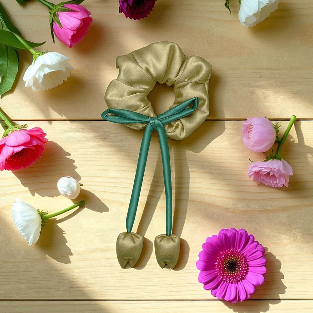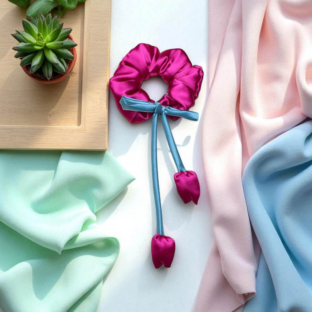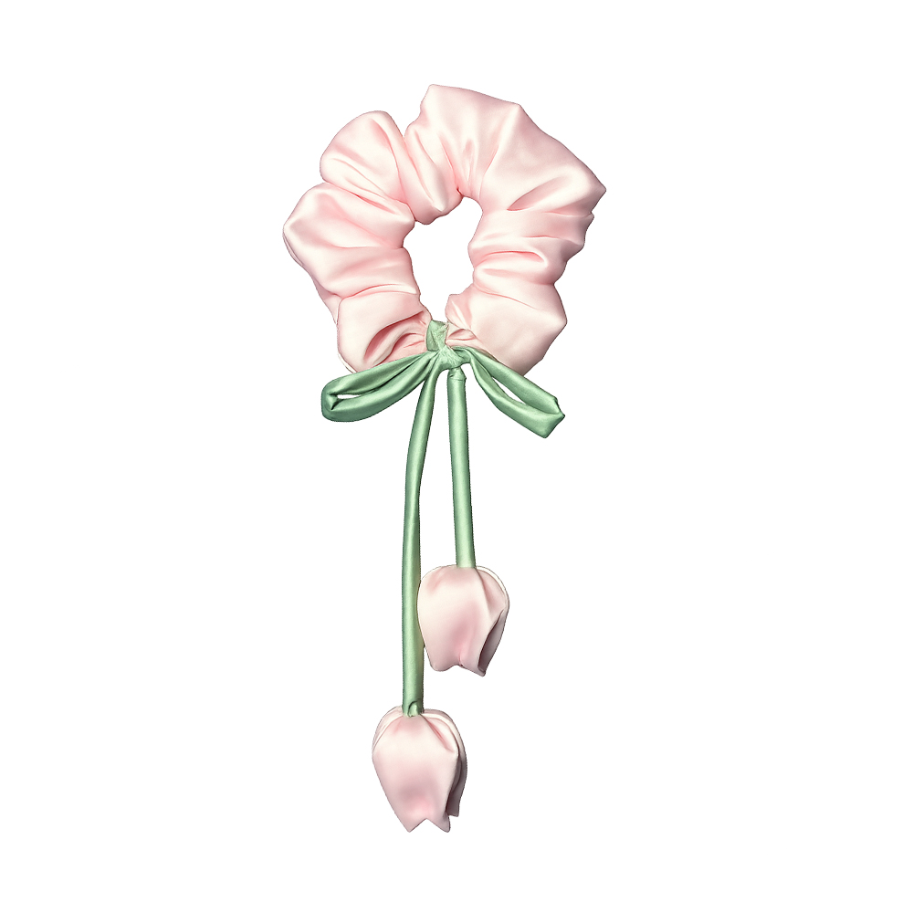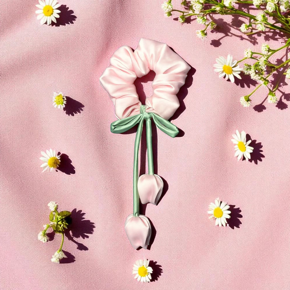 لطافت بهار را به موهای خود هدیه دهید! این اسکرانچی زیبا از ساتن صورتی نرم ساخته شده و با یک پاپیون سبز و آویزهای ظریف به شکل غنچه گل لاله تزئین شده است. اکسسوریای خاص و رؤیایی برای تکمیل استایل شما و جلوگیری از آسیب به موها.